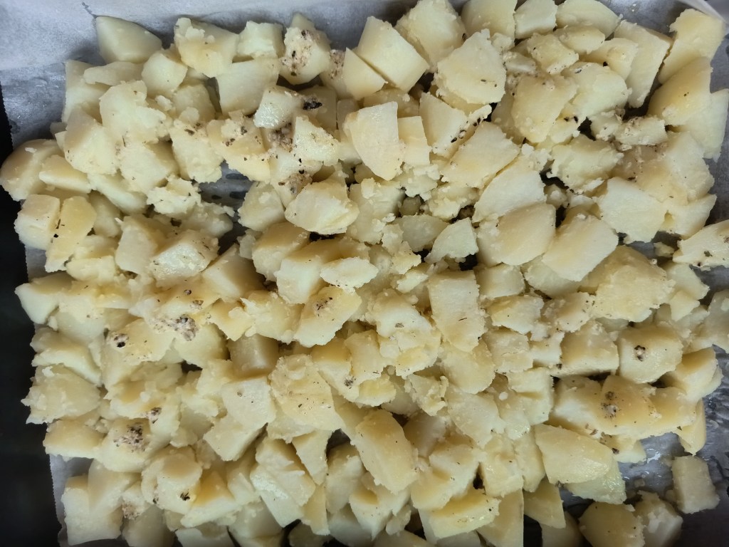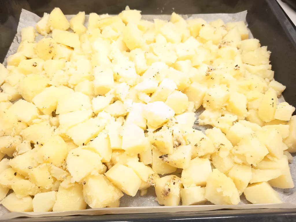4. Când a expirat timpul, am scos rapid presiunea (QR), am scurs cartofii, am uns tava cu puțin ulei de măsline și am pus cartofi in ea. I-am uns cu amestecul obținut în pasul anterior, iar apoi i-am băgat la cuptor pentru 10 minute. După ce au trecut primele 5 minute, i-am scos și i-am întors. Apoi, i-am pus iarăși la cuptor.